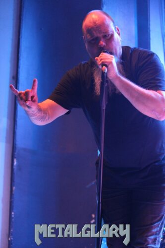 Kann sich Nick Holmes mit Blick zur Raucherlounge oben zwar wieder einen kleinen Kommentar nicht verkneifen, so ist er ansonsten gut drauf. Zwar gewohnt einsilbig, aber auch das gehört zur Band.