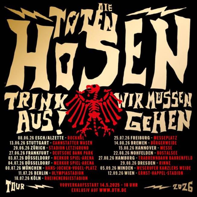 news. DIE TOTEN HOSEN – Zusatzkonzerte „Trink Aus! Wir Müssen Gehen“-Tour wird um eine Handvoll Konzerte verlängert