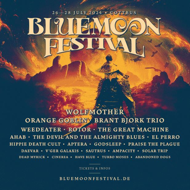 Live dabei, internationale Szene-Größen wie WOLFMOTHER, BRANT BJORK TRIO (ex-KYUSS / QUEENS OF THE STONE AGE), ORANGE GOBLIN, WEEDEATER, AHAB oder ROTOR, sowie die heissesten Underground-Tips wie GODSLEEP, SOLAR TRIP, PRAISE THE PLAGUE, DAEVAR, HIPPIE DEATH CULT und viele mehr. Das BLUE MOON FESTIVAL 2024 verspricht auch in diesem Jahr ein ultimatives Erlebnis für alle Liebhaber von Stoner, Doom, Metal und Psychedelic Rock.