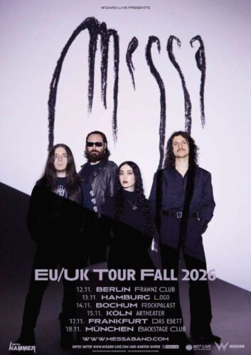 MESSA kommen im Herbst diesen Jahres mit ihrer EU / UK Tour Fall 2026 nach Deutschland – und bringen ihr gefeiertes Album The Spin endlich auf die hiesigen Clubbühnen. Zwischen dem 12. und 18. November stehen Berlin, Hamburg, Bochum, Köln, Frankfurt und München auf dem Tourplan. Nach ausverkauften Shows in Italien und einer vielbeachteten Support-Tour mit Paradise Lost präsentiert die italienische Band ihren intensiven Mix aus Doom Metal, Goth Rock, klassischem Heavy Metal und jazziger Atmosphäre nun erstmals im Rahmen einer großen EU/UK-Headliner-Tour.